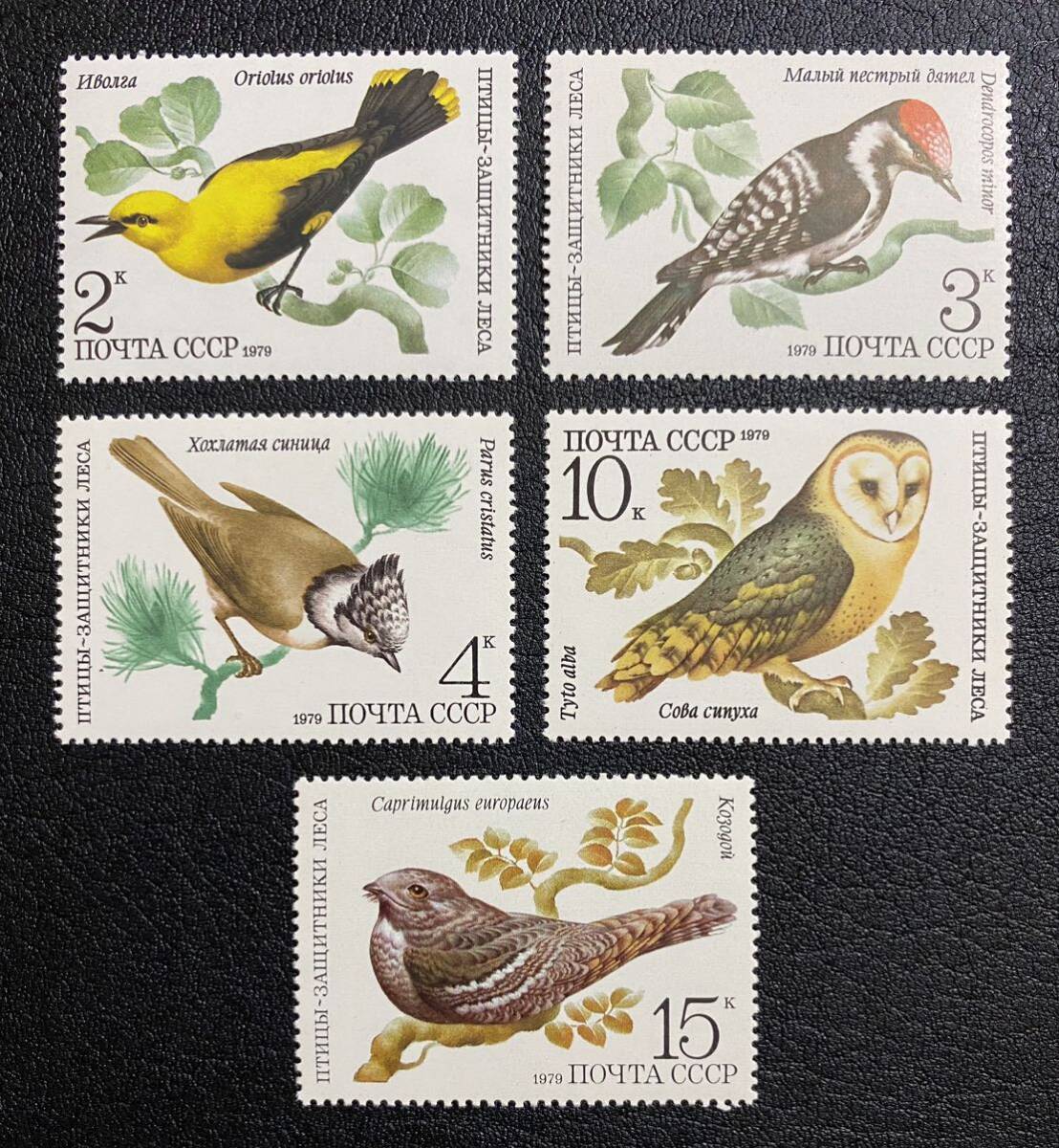 - ソ連 鳥 キガシラコウライウグイス コアカゲラ カンムリガラ メンフクロウ ヨーロッパヨタカ 5種完 未使用 NH