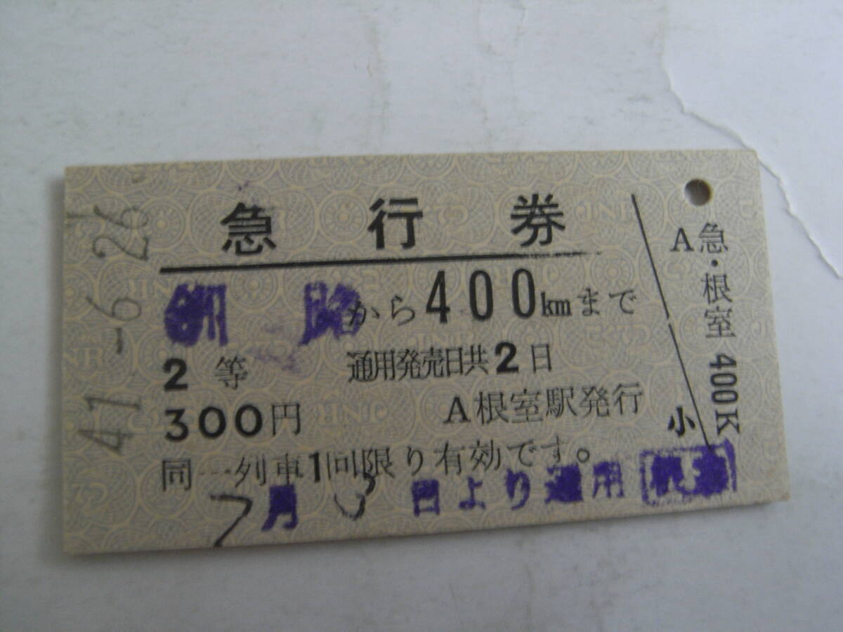 - 急行券 釧路から400kmまで 2等300円 昭和41年6月26日 根室駅発行