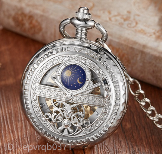 - 懐中時計 機械式手巻き スケルトン 数字盤 ポケットウォッチ レトロ チェーン付き 新品未使用 /シルバー