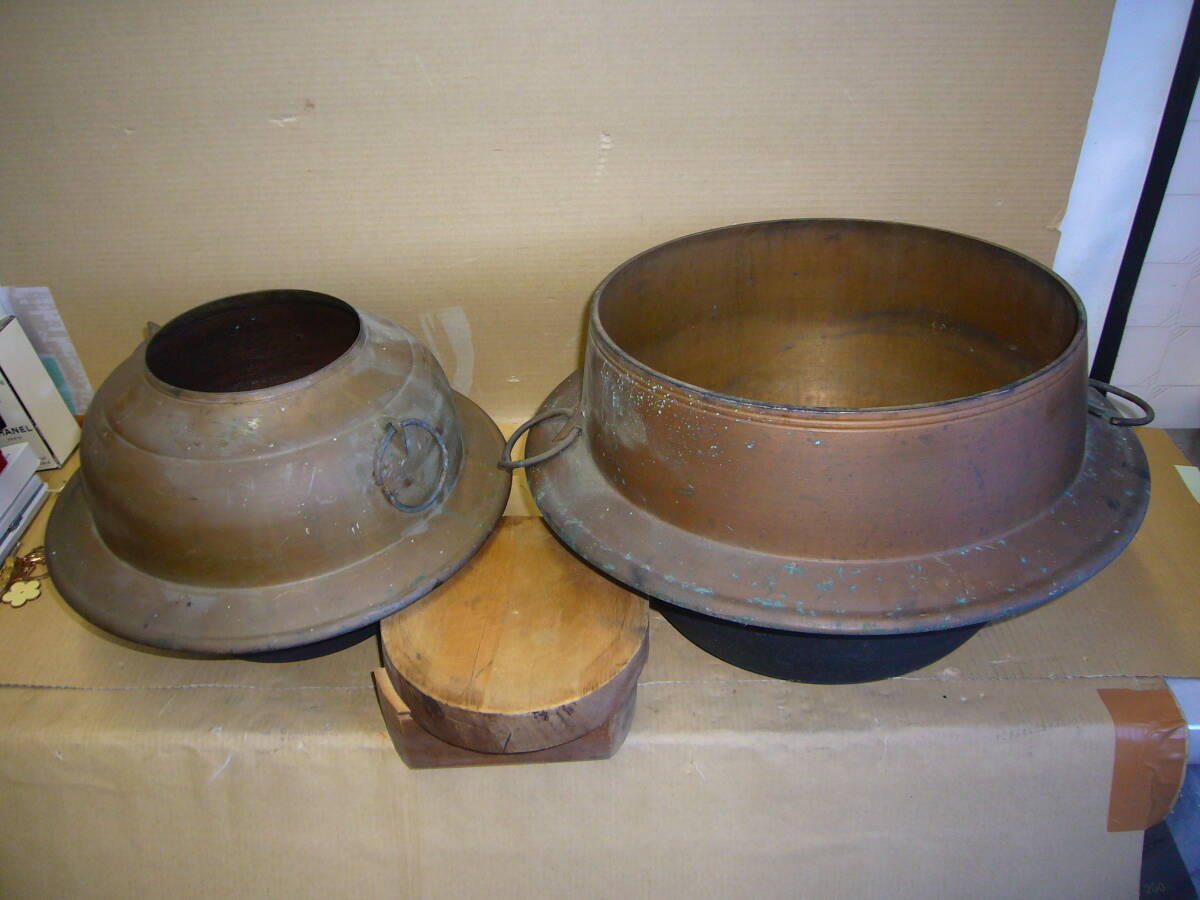 - 銅製? 茶釜(木製蓋付き)・羽釜(蓋無し) 2点セット 総重量 約10.5Kg 中古品 当時物