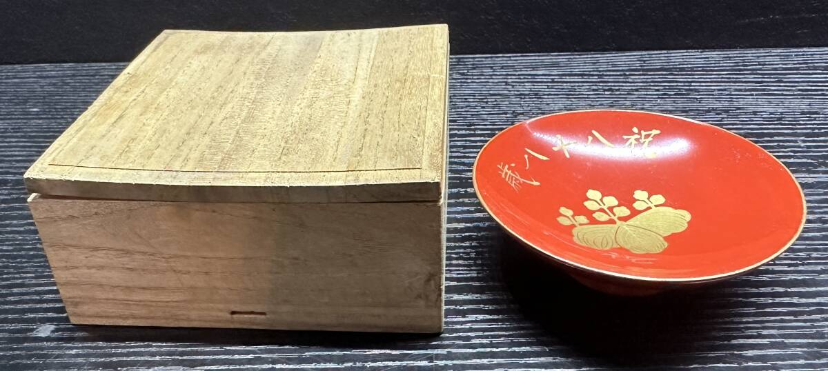 - 五七桐紋 桐紋 盃 酒杯 金彩 米寿 漆塗 漆器 酒盃 祝八十八歳 木箱 88才 酒器 S525