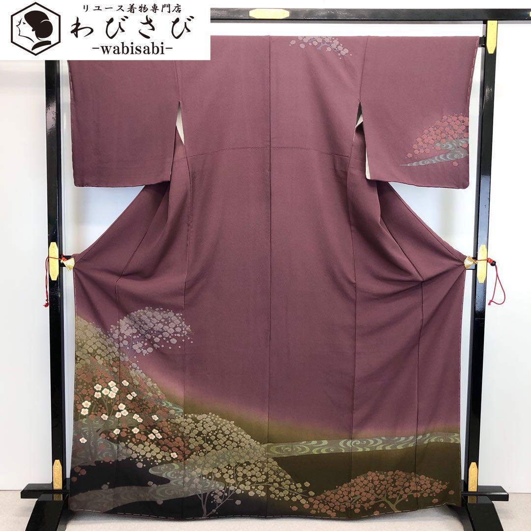 紫檀色の落ち着きのある色味の縮緬に暈し、金彩が使われた美しい絞り染の花模様がデザインされた素敵な柄裄のお品でございます。
