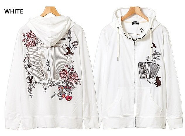 > 黒菟華「長耳のアコーディオン奏者」総刺繍薄手パーカー◆LIN ホワイトMサイズ AL-759070 和柄 和風 兎 ウサギ ユニセックス