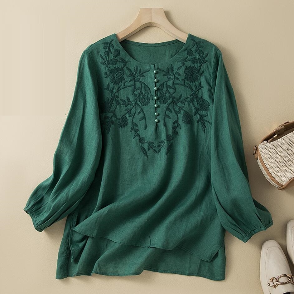 - 秋新品*シャツブラウス トップス レディース 綿麻 カジュアル お花刺繍入り 長袖 大人 かわいい 大きいサイズ チュニック * 4色選ぶ