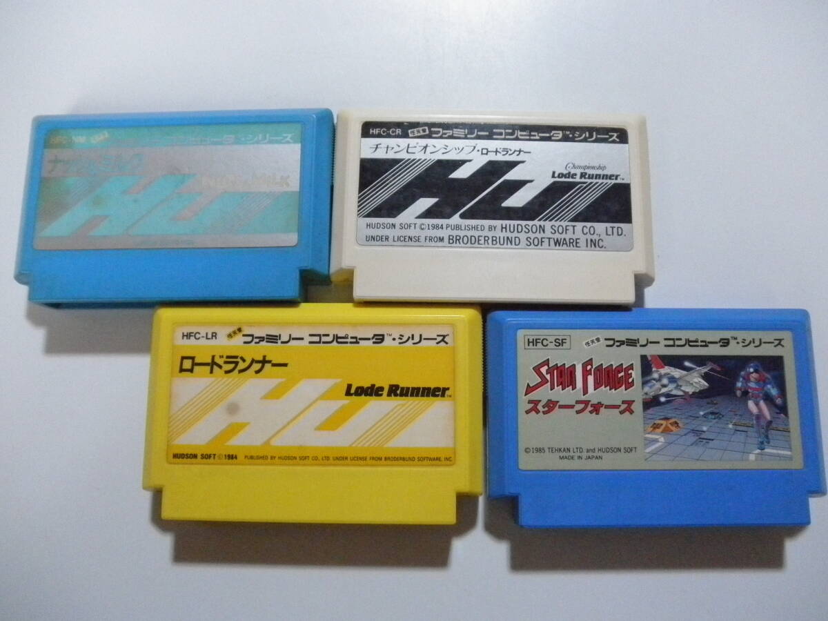 > ●FCソフトセット ハドソン裏シール青文字4本(ナッツ&ミルク、ロードランナー2種、スターフォース) 初期起動確認済