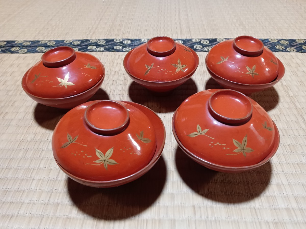 > 【旧家の蔵から】昭和中期 漆器 お椀 金彩蓋付き汁椀 5客 (2)紅葉模様(蓋裏に鹿) 赤 漆塗り 天然木 伝統工芸 |125523