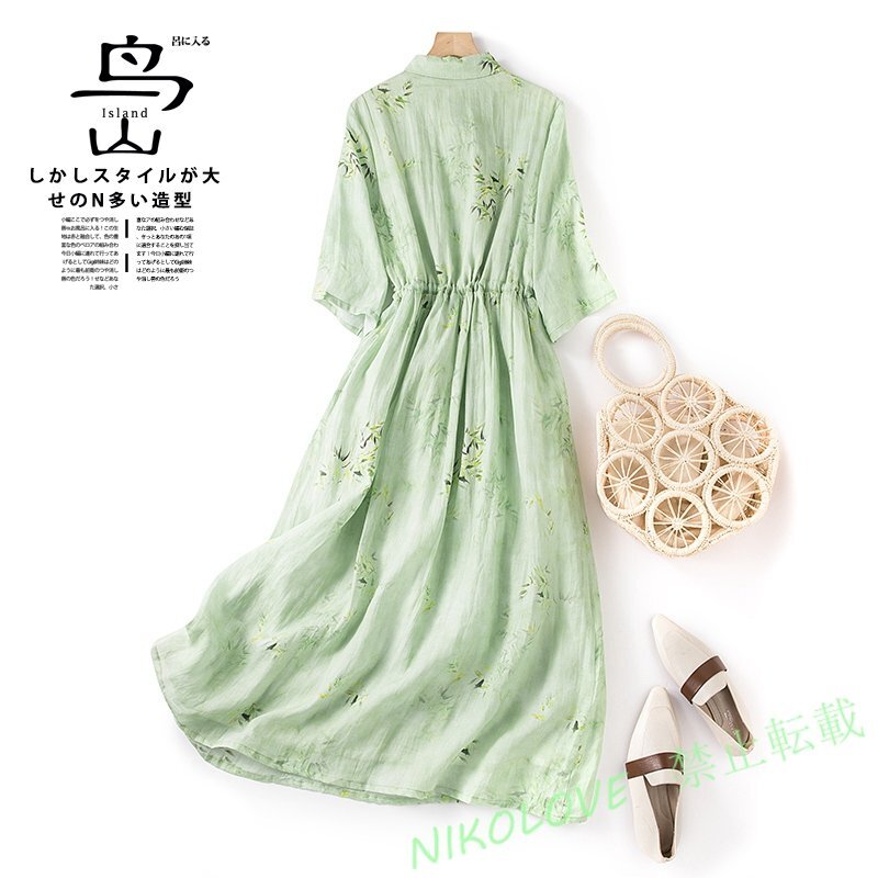 - 新品レジャー ゆったり 古風 軽薄 シャツ やせて見え プリント柄 半袖 ワンピース 薄い緑 LE755