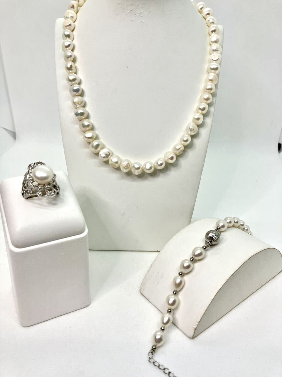 > 【新品未使用】淡水パールネックレス・ブレスレット・リング三点セット/淡水真珠/フリーサイズ/6月誕生石/フォーマル/アンティークデザイン