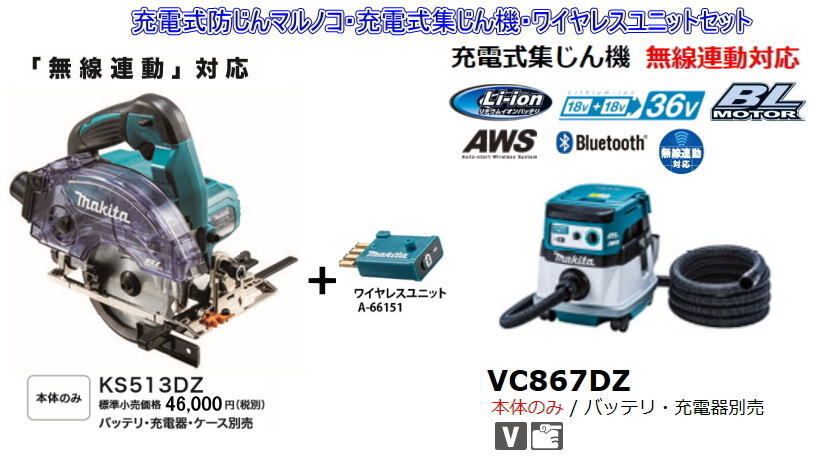 - マキタ 充電式防じんマルノコKS513DZ・充電式集じん機 VC867DZ ワイヤレスユニットセット