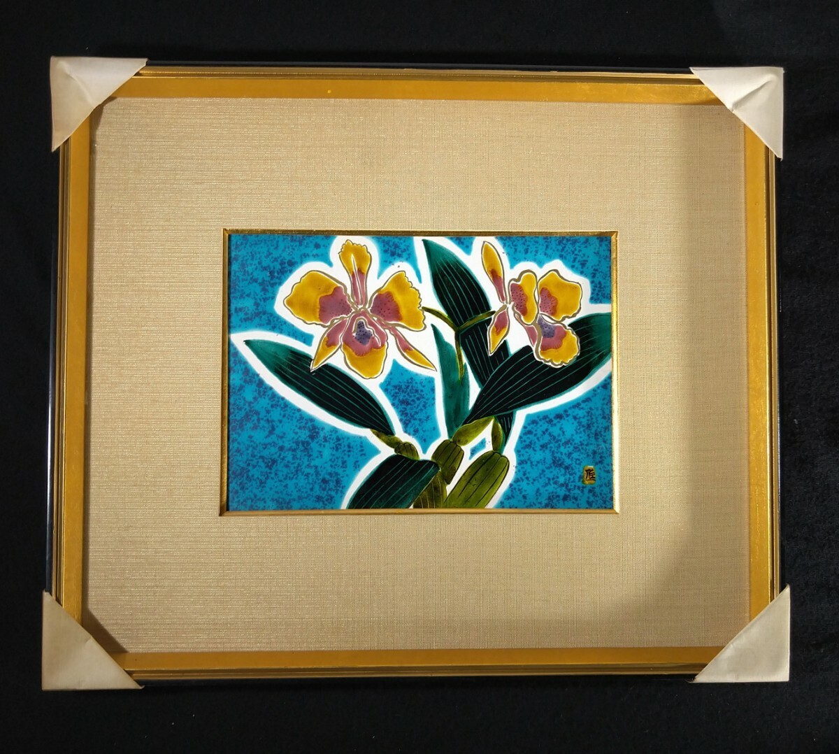 - 松本佐一 色絵 カトレア図 陶板 43cm 額装 松屋窯 九谷焼 県無形文化財保持者 b-大12f3679