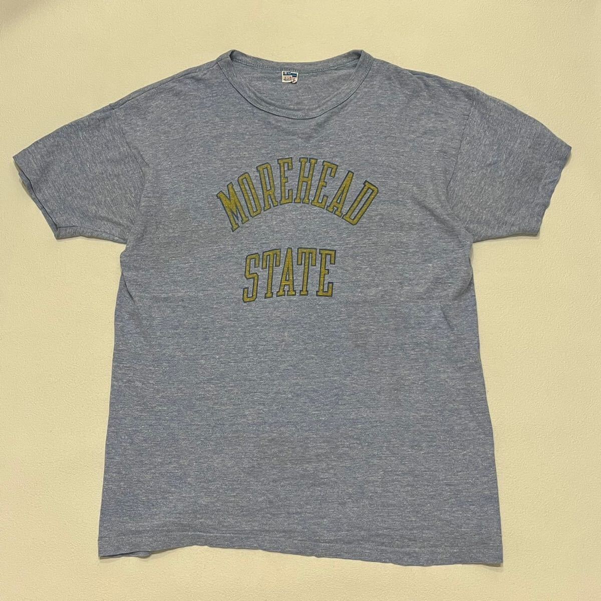 - k430 70s ビンテージ アメリカ 製 バータグ champion 染み込み 霜降り 2段 Tシャツ ロゴ ブルー XL チャンピオン vintage USA MOREHEAD