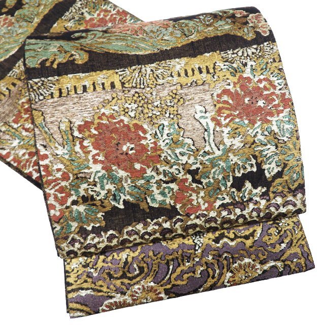 > 袋帯 中古 リサイクル 正絹 フォーマル 仕立て上がり 六通 花の図 箔糸 黒色 多色 金 きもの北條 A1045-9