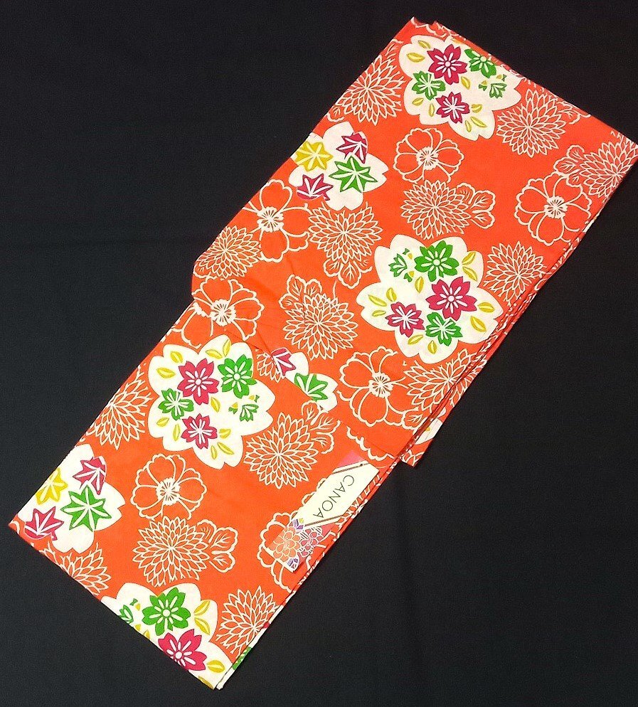 - 7577*CANOA* 綿 浴衣 フリーサイズ「菊・朱」【わけあり】-