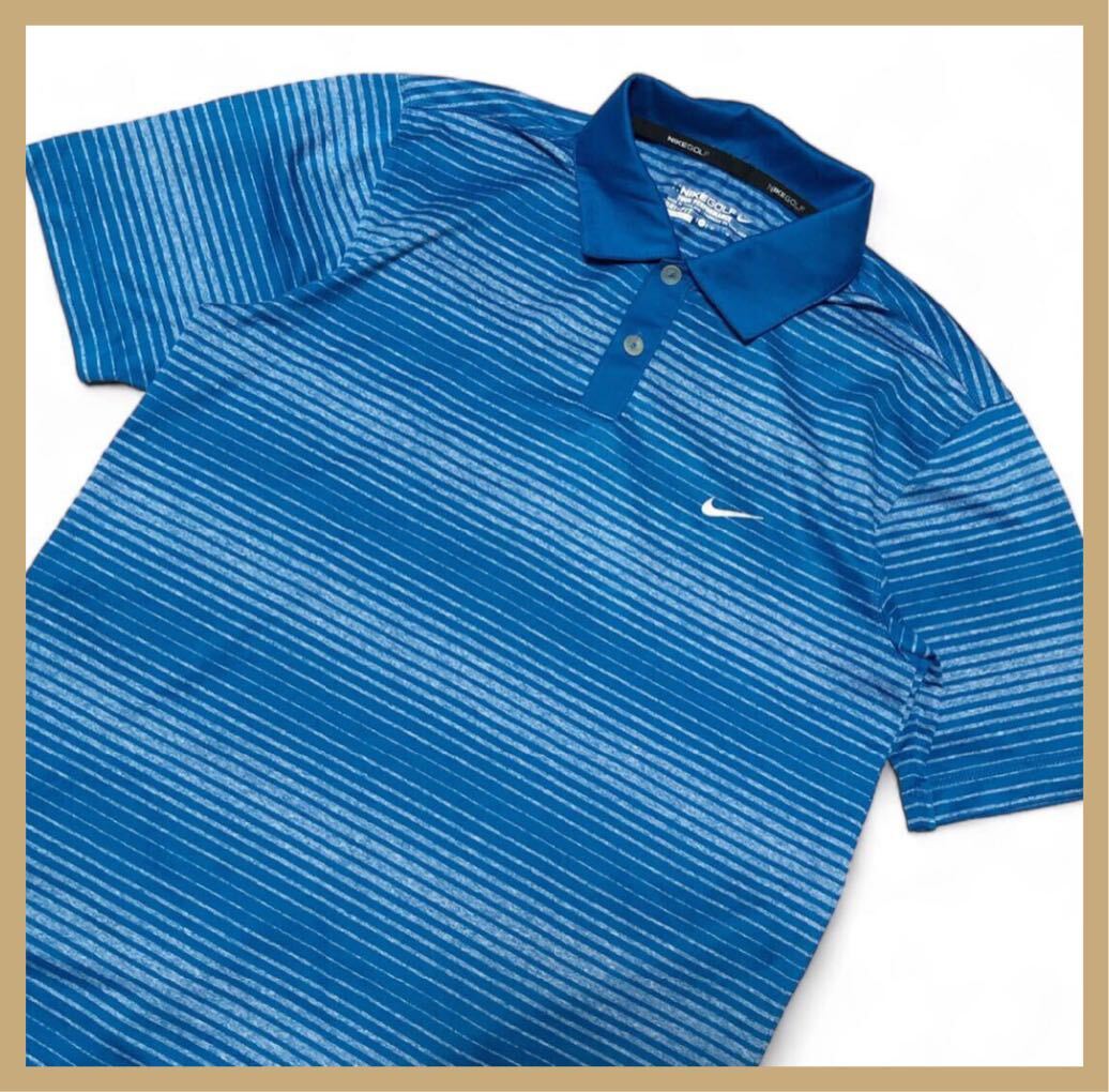 - 918●NIKE GOLF ナイキゴルフ●スウッシュプリント ボーダー柄 ゴルフ 半袖 ポロシャツ ブルー×ホワイト M