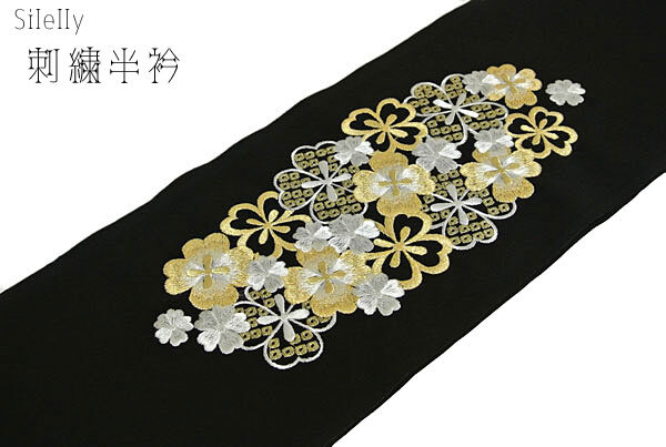 > 半衿 振袖 シルエリー刺繍半衿 桜鹿の子 黒 金 日本製 刺繍半えり 刺繍半襟 成人式 結婚式 卒業式 1628-4 メール便 送料無料