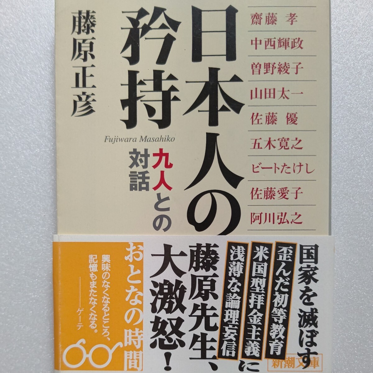 > ●日本人の矜持 九人との対話 藤原正彦 山田太一 五木寛之 北野武 佐藤愛子 齋藤孝 曾野綾子 中西輝政 阿川弘之 佐藤優 ビートたけしほか