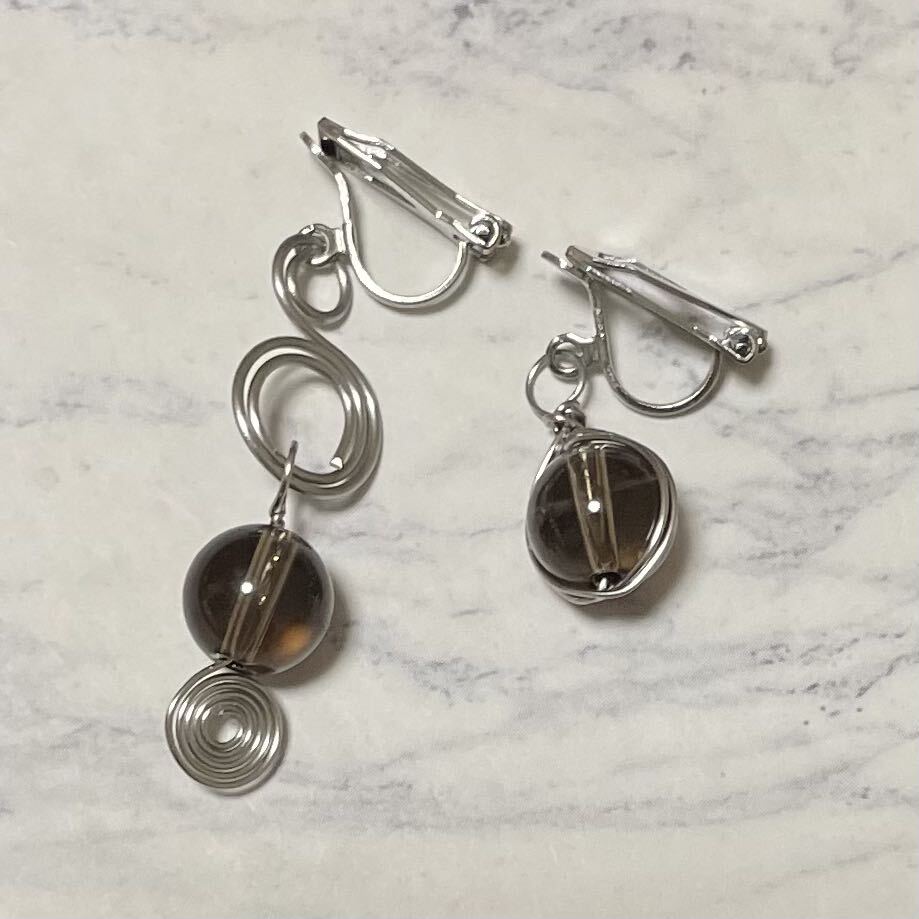 - A27. 天然石 イヤリング スモーキークォーツ ハンドメイド サージカルステンレス アレルギーフリー ニッケルフリー アシンメトリー