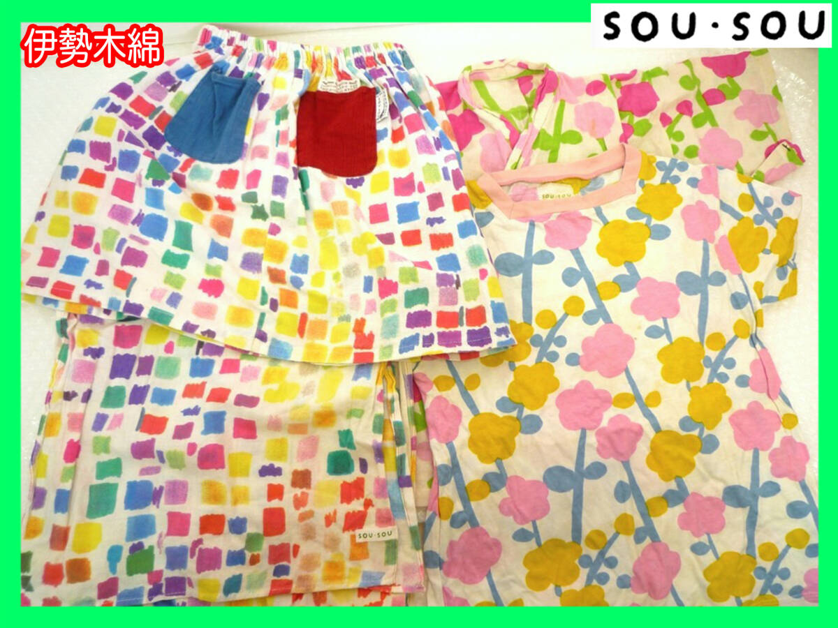 - 伊勢木綿 SOU・SOU わらべぎ こども 4点セット スカート 絵具皿 Tシャツ 手ぬぐい えのぐざら じんべい上衣 寒紅梅 春陽お買得 必見①