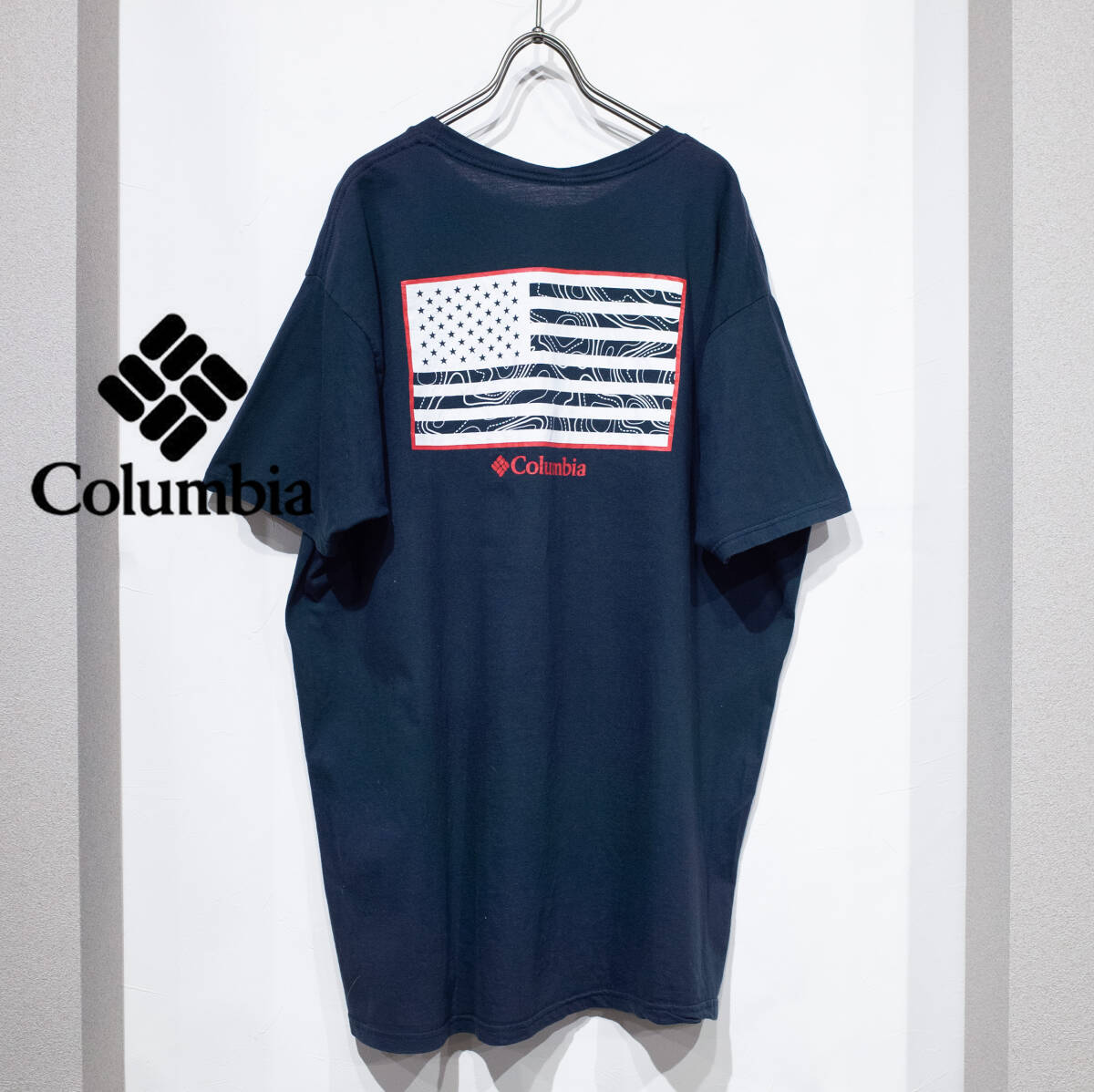 - XL / Columbia コロンビア コットン 半袖 Tシャツ 背面 グラフィック TEE 星条旗 デザイン プリント ネイビー 紺 アウトドア 古着 フェス
