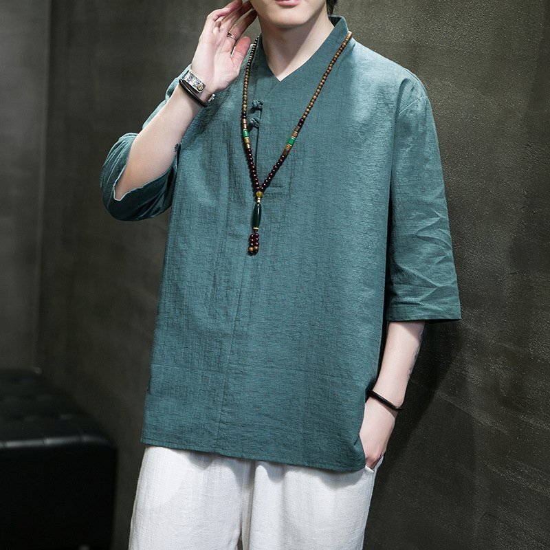 - 春夏 七分袖 綿麻 薄手 Tシャツ メンズ ゆったり 大きいサイズ リネンシャツ 無地 涼しい グリーン
