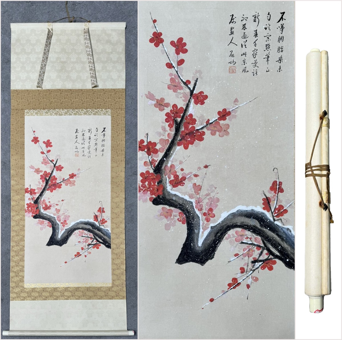 - 古美術 掛け軸 中国・近現代 「啓功書」 紙本 【紅梅図】 立軸 書道 巻き物 真筆逸品 肉筆保証 唐物 古画 LT-240793