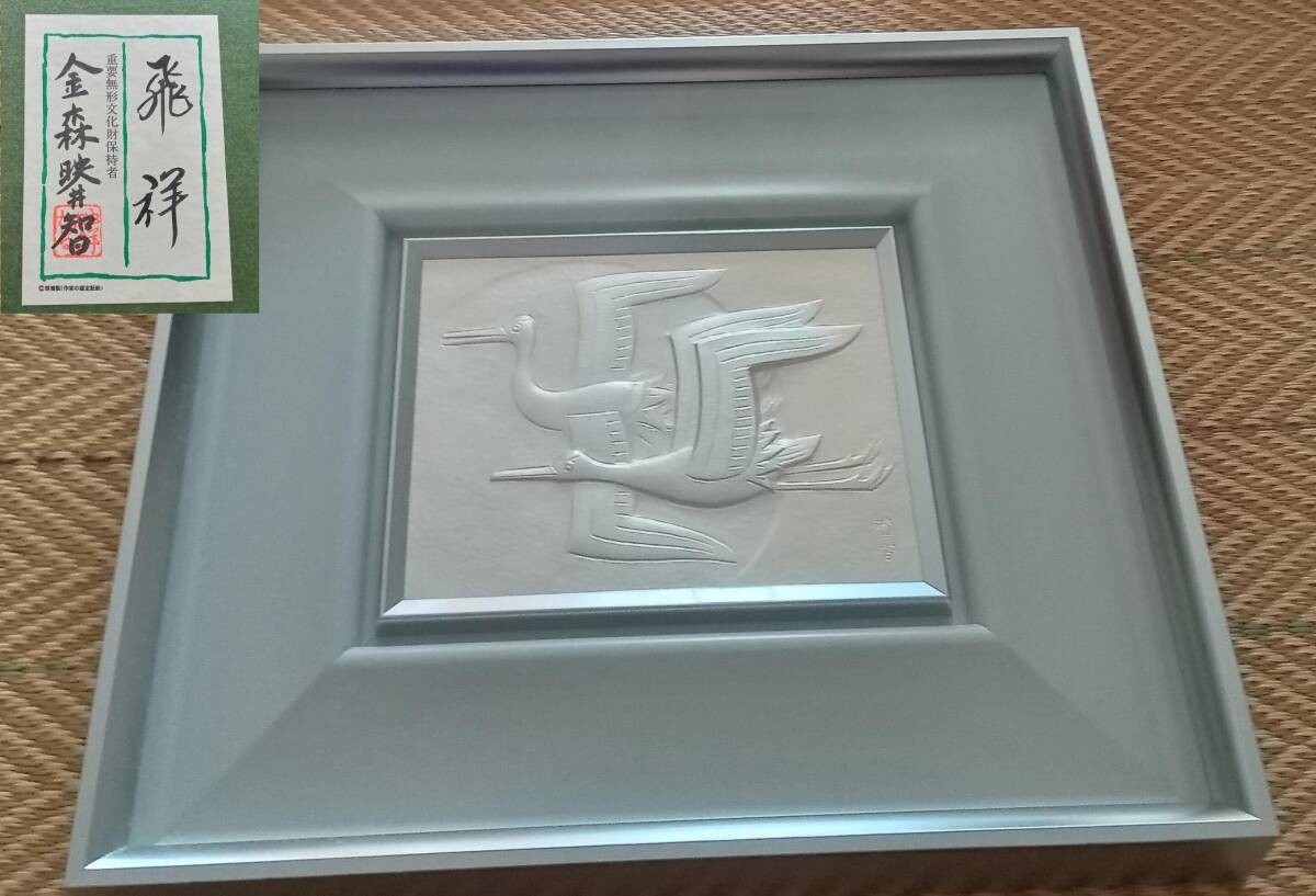 - ♪ 飛祥 金森映井智 重要無形文化財保持者(通称 人間国宝)作家の認定証紙 パネル額 金森映井智作品 飛祥 30.7×34.8×5cm位