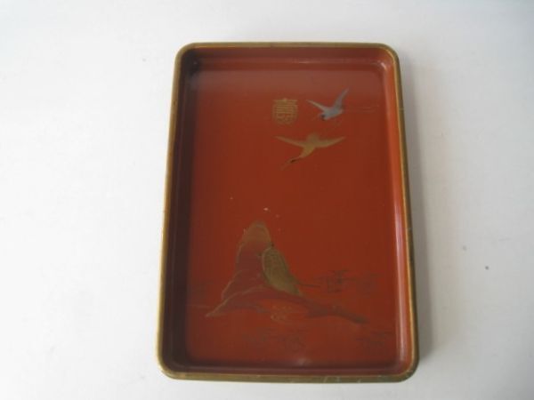 - お盆 トレー 木製漆器 金の縁 内朱・外黒 鶴と亀 サイズ:約30×21×H3㎝/23N8.1-16