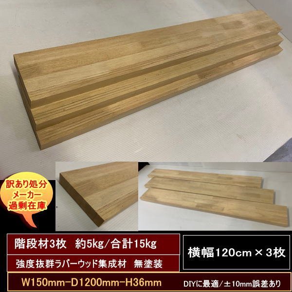 > 送料無料 訳あり処分 横長階段材 150-1200-36mm 強度抜群 ラバーウッド集成材 3セット 合計約15kg 無塗装 DIYにお勧め!
