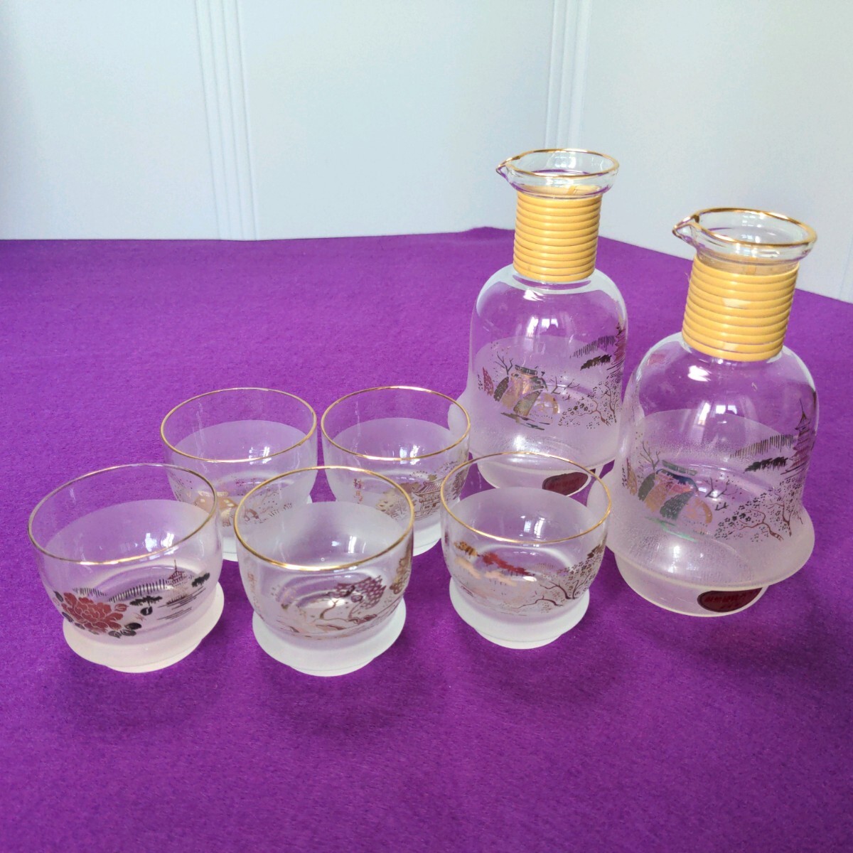 - 未使用品 風韻清爽 京五題絵図 徳利&お猪口 酒器セット 耐熱硬質ガラス 計6点 アンティーク 京都 嵐山 ぐい飲み グラス 直火OK 金縁