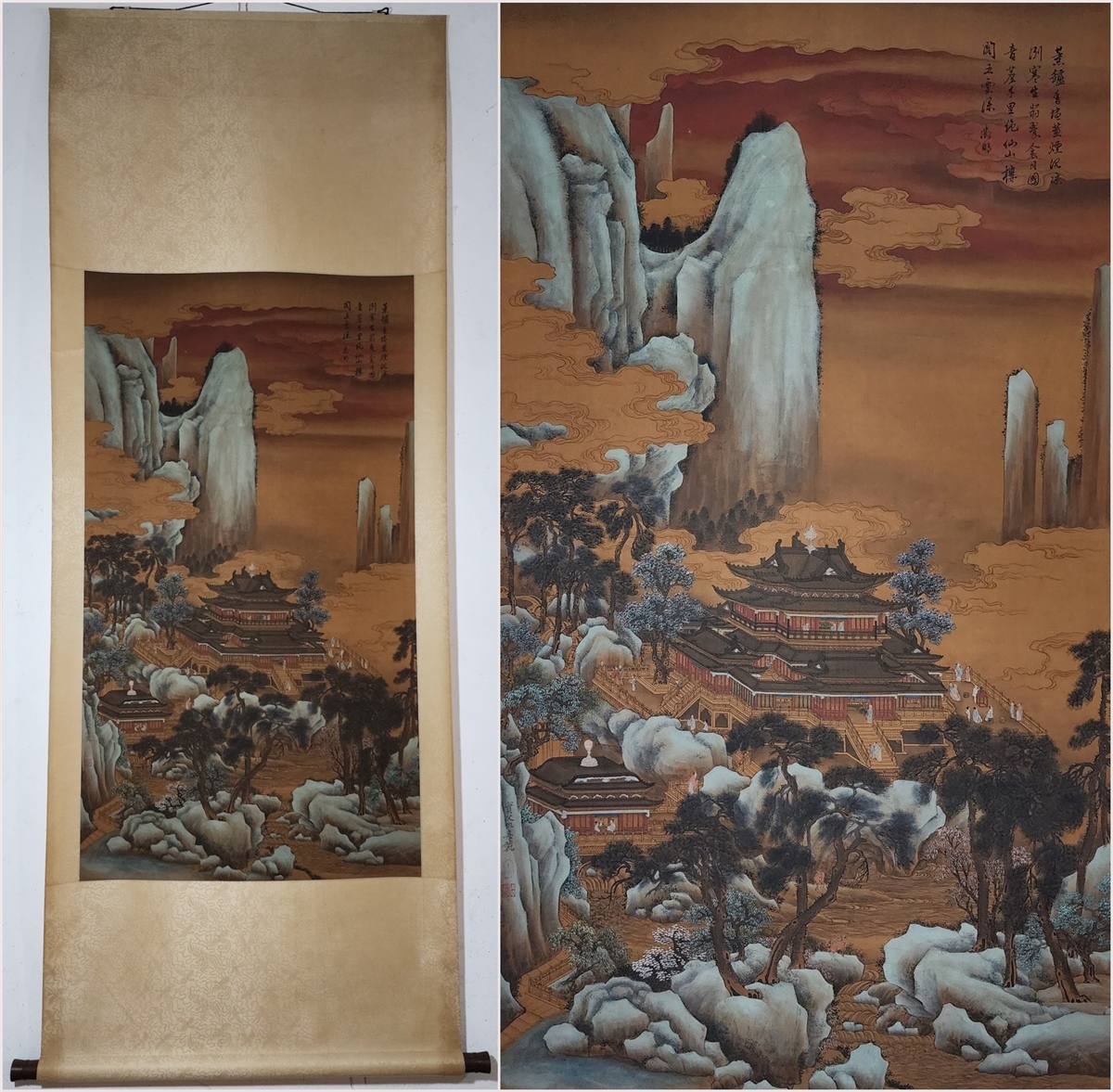- 古美術 掛け軸 中国・明時代 「仇英書」 絹本 【雲深楼閣図】 立軸 書道 巻き物 真筆逸品 肉筆保証 唐物 古画 LT-2408105
