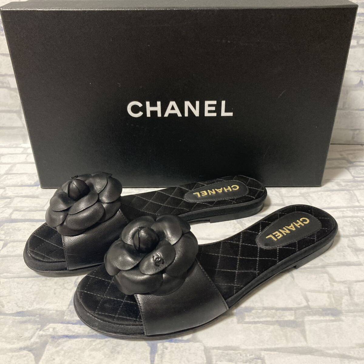 - 美品 CHANEL フラットサンダル ミュール カメリアモチーフ ブラック サイズ35