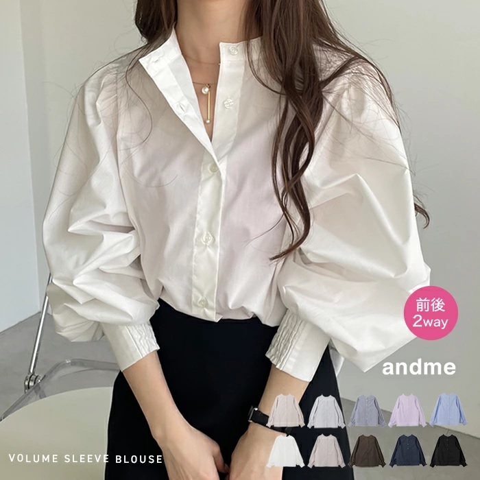 > ■ 前後2way ボリューム 長袖 シャツ ブラウス レディース バンドカラー 体型カバー きれいめ オフィスカジュアル 春 夏 秋 冬