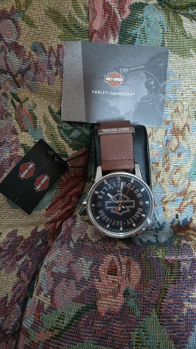 - ハーレーダビッドソンメンズバーシールドブラウンレザーステンレススチールウォッチ