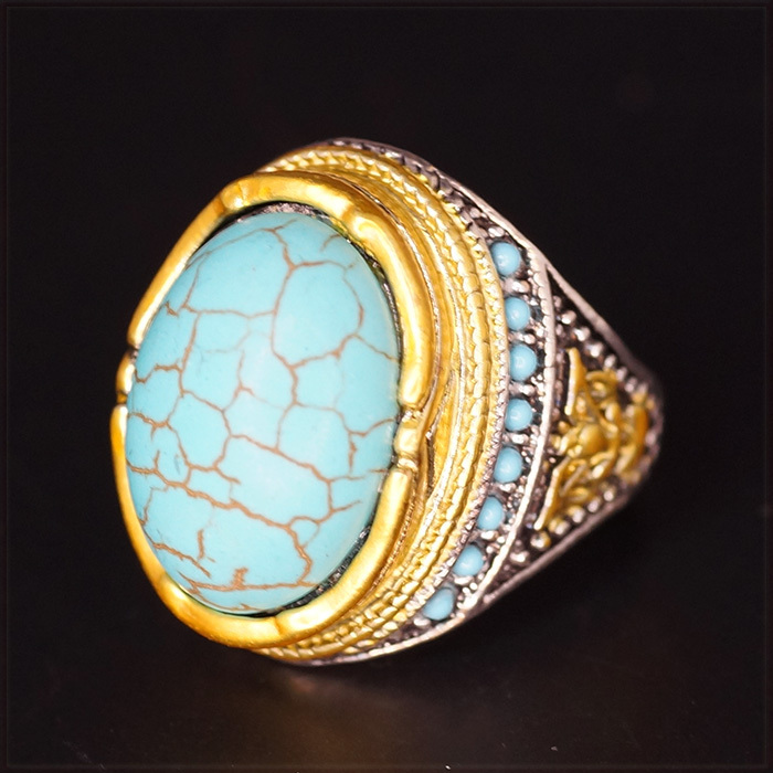 - [RING] Antique Design Turquoises Stone オーバル ターコイズ ブルー ストーン シルバー & ゴールド 24mm ワイド リング 11号