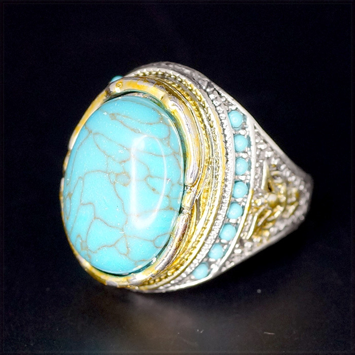 > [RING] Antique Design Turquoises Stone オーバル ターコイズ ブルー ストーン シルバー & ゴールド 23mm ワイド リング 19号