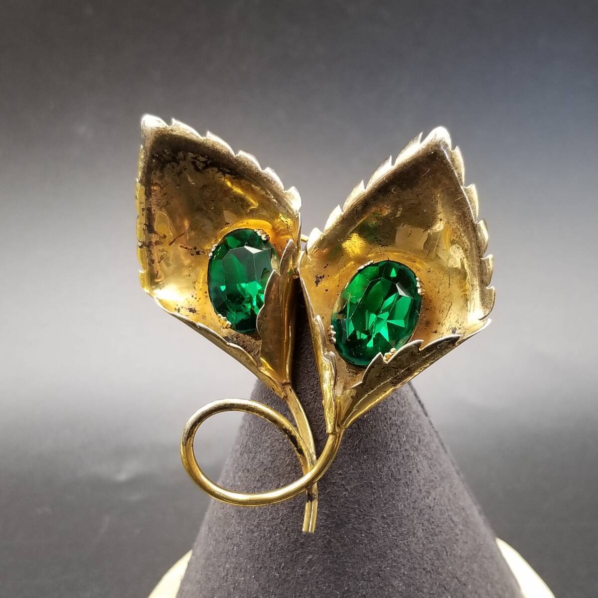 > 花 カラー モチーフ 925 シルバー ヴェルメイユ ヴィンテージ フワラー ブローチ 緑石アクセント ゴールドトーン 立体 存在感 Y15-A