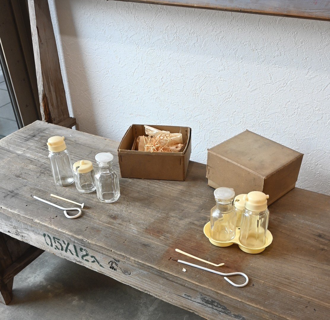 > ○可愛い調味料入れ 2組セット 醤油/ソース/七味のガラス瓶/トレー ② 7点 レトロポップ 昭和 未使用 古道具のgplus広島 2408i