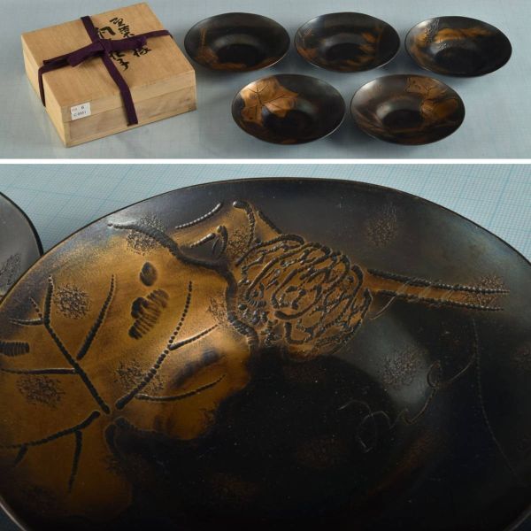 - C08951 玉川堂 夏菜模様 銅製托子 5客:真作