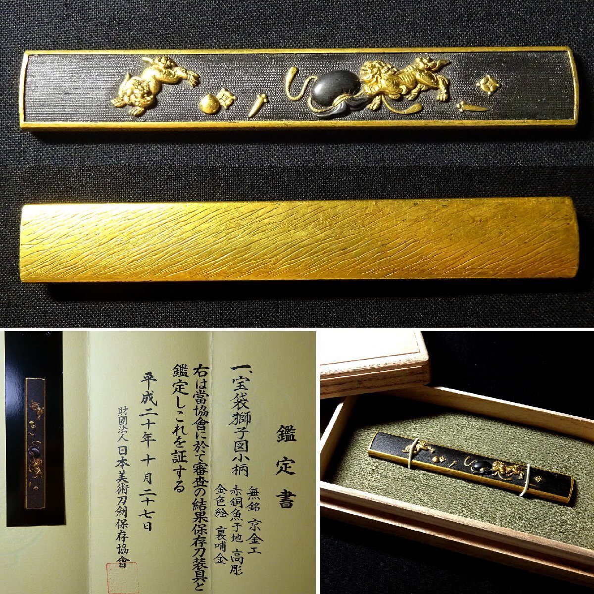 > 【敬逢】秀逸 刀装具 保存刀装具鑑定書 宝袋獅子図小柄 無銘 京金工 赤銅魚子地 高彫 金色絵象嵌 裏哺金 化粧箱入 侍 SAMURAI TS40