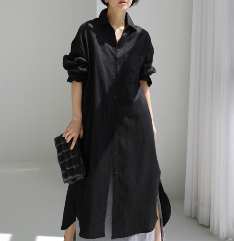 - 秋新品 /人気推薦 /ロングワンピース 綿麻 レディース ゆったり シャツワンピース マキシ丈 おしゃれ 着やせ 大きいサイズ/ブラック