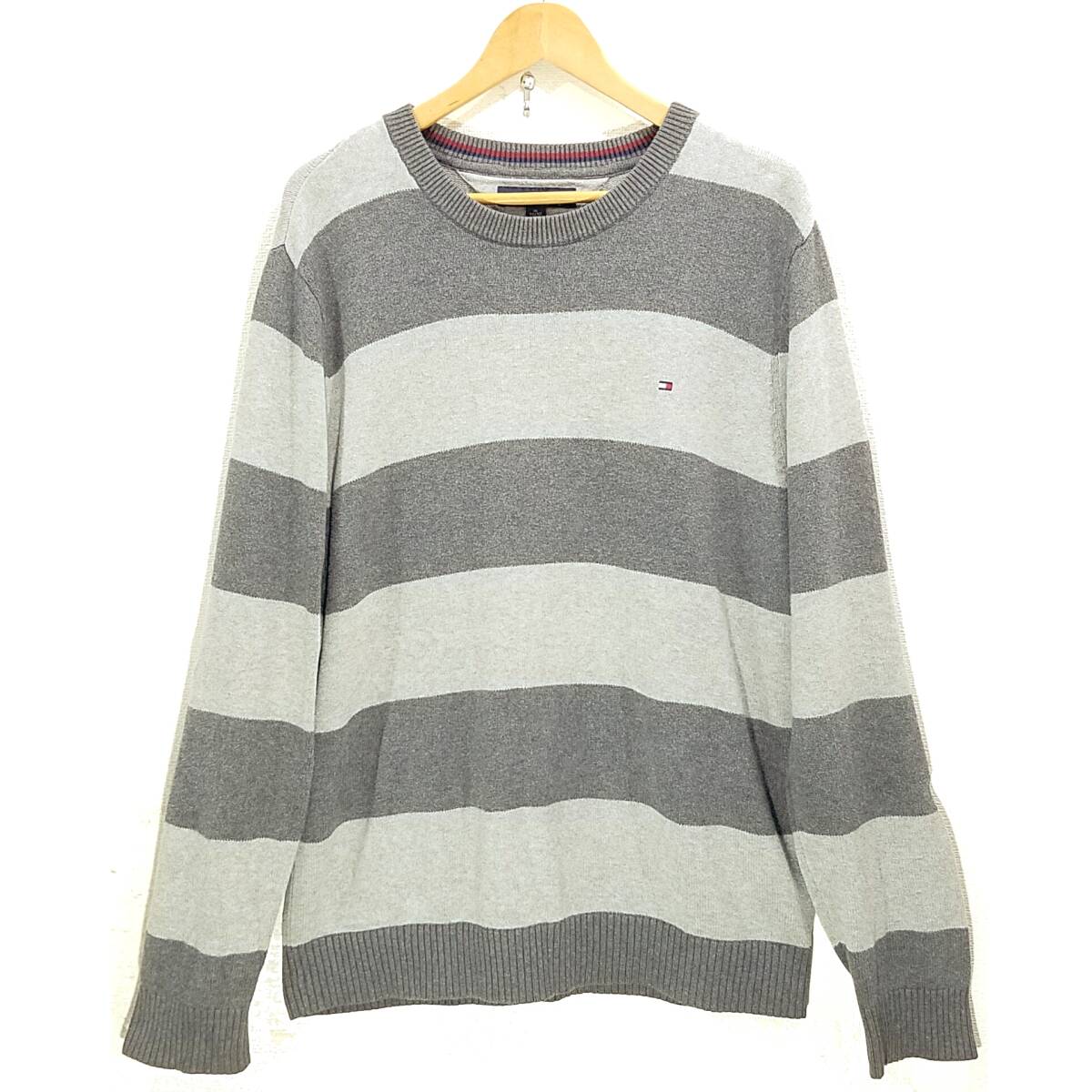 - 送料600円~(即決は送料無料)TOMMY HILFIGER太ボーダー綿メンズXLグレー×ライトグレー秋冬リブニットセーターLLトミーヒルフィガー2L