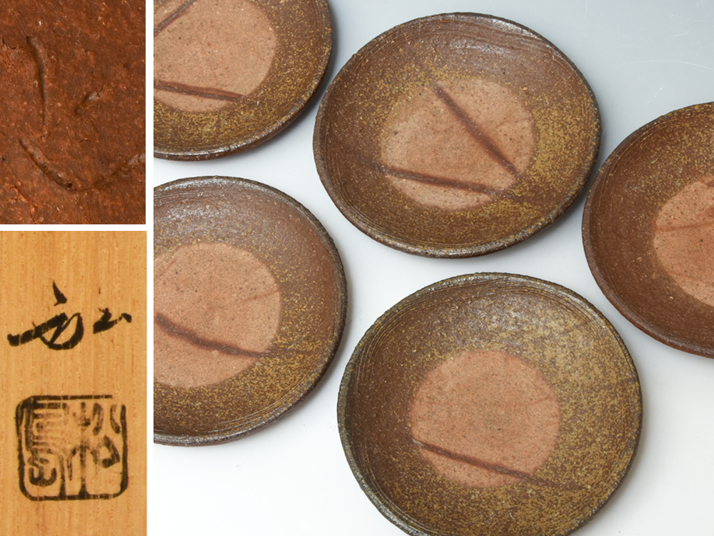 > 松嶋弘 (造) 備前 波状文 組皿 5客揃 共箱 共布 しおり 銘々皿 懐石道具 茶道具 陶磁器 z7986t