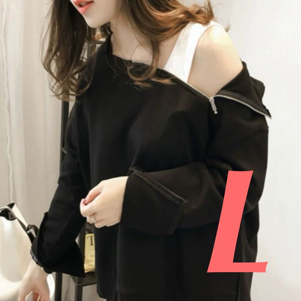 > オフショルダー パーカー 2way ジップ 長袖 トップス フード プルオーバー ブラック 小さめ 寸法確認 黒 L