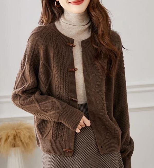 - 秋新品*ニットカーディガン レディース ニットセーター カーディガン トップス オフィス 前開き ケーブル編み ニット アウター*コーヒー