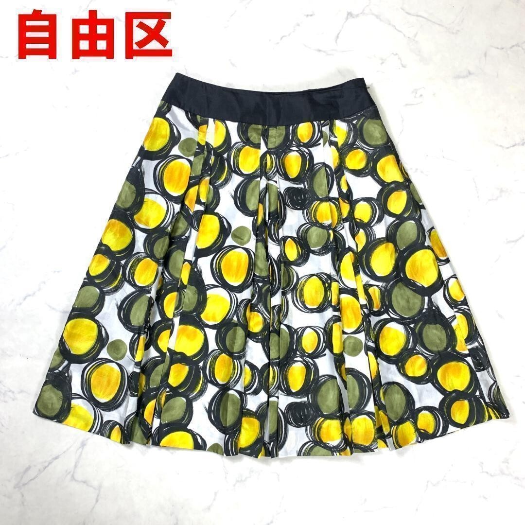 - A414 自由区 ロングスカート 総柄 フレア 裏地あり イエロー ブラック 白 ホワイトドット 黄色 黒 38