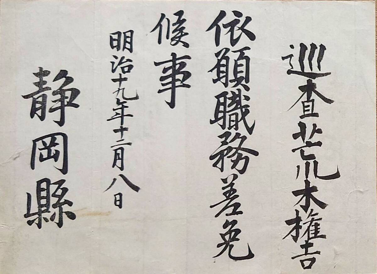 - f24090672〇官庁辞令書 静岡県 巡査 明治19年〇和本古書古文書