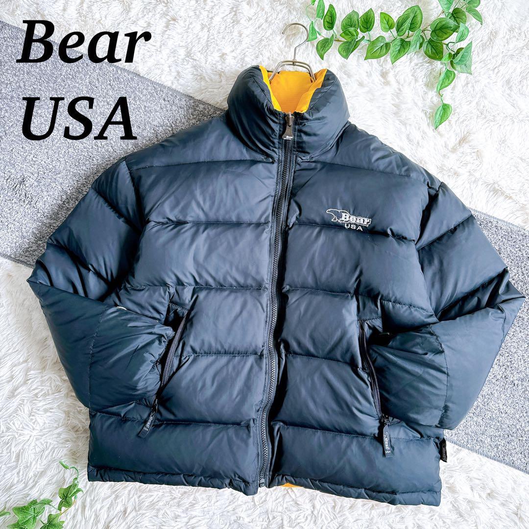 > 古着 90s Bear USA ベアー ダウンジャケット 刺繍ロゴ ワッペン リバーシブル ブラック 肉厚 L ブラック