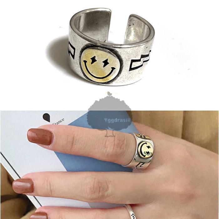 > YGG★ニコちゃん スマイル サンダー スター柄 太リング 指輪 銀 シルバーカラー 13号 男女兼用 金 ゴールド メンズ レディース