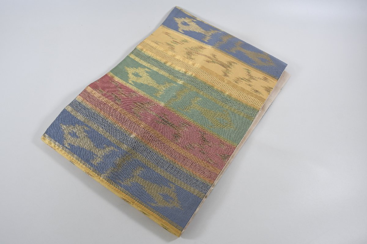 > 名古屋帯 縞 渡来文様 狩猟道具文様 壁画 金糸 正絹 帯丈344cm ★着物屋 ne-11691 桜庭呉服店