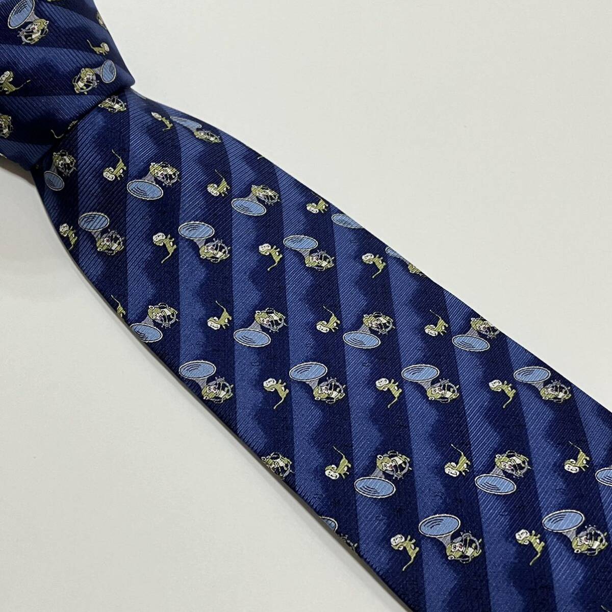 - サル 楽器 アニマル デザイン シルク ネクタイ 古着 ブルー ネイビー 209-6
